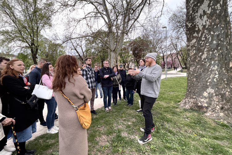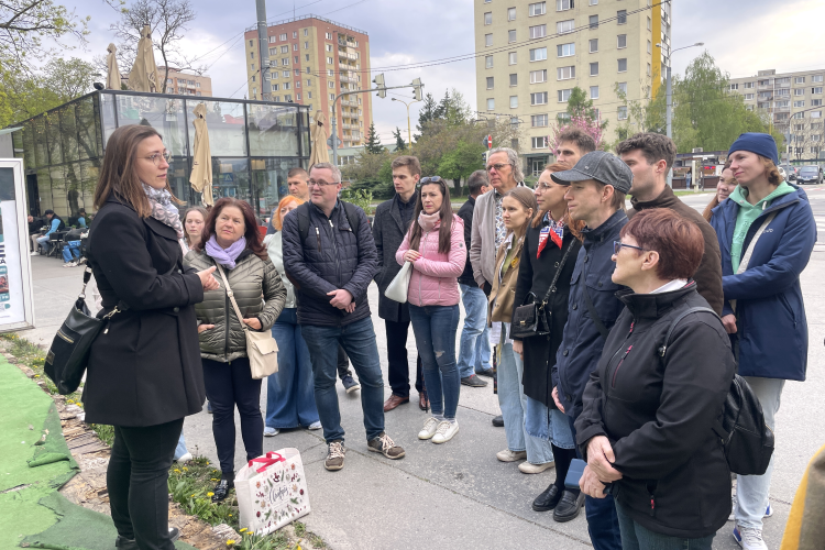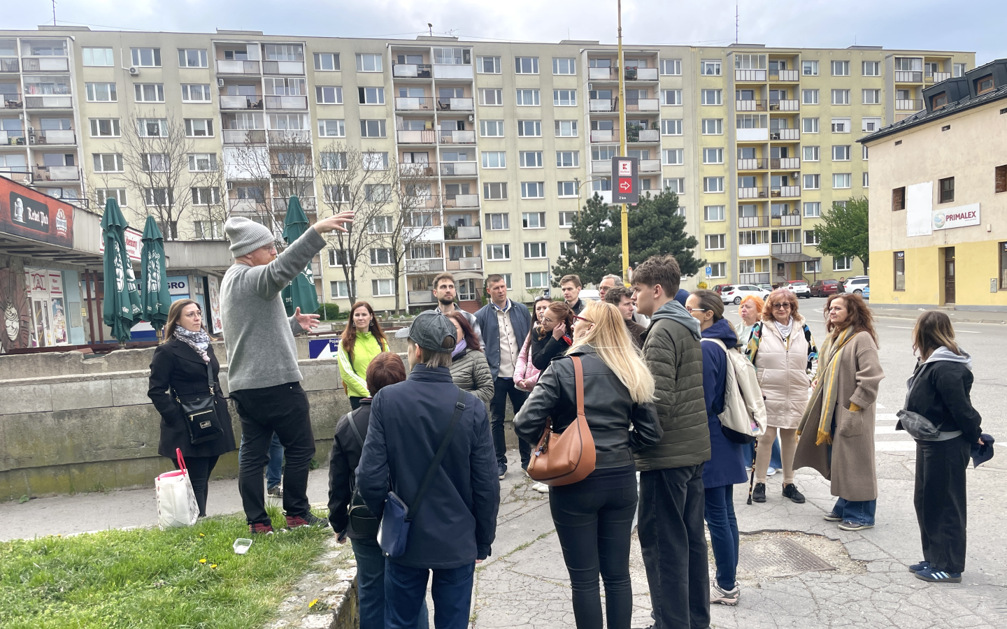 Vo štvrtok (16. apríla) sa približne 25 účastníkov zúčastnilo komentovanej prechádzky s hlavným architektom Petrom Kroppom a Mišom Hudákom, ktorá ponúkla nový pohľad na Námestie osloboditeľov a jeho širšie okolie.